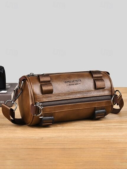 Men’s Brown Faux Leather Crossbody Shoulder Bag with Front