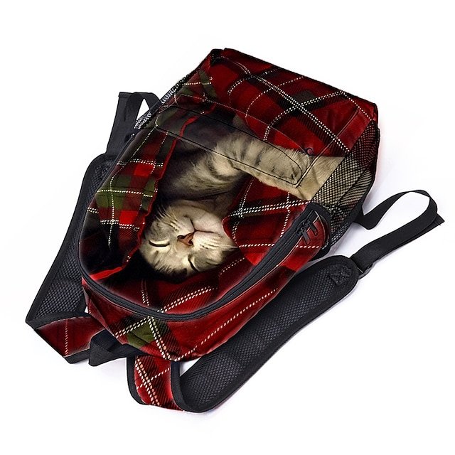 Large Capacity Animal Cat Print Backpack with Red Plaid Design